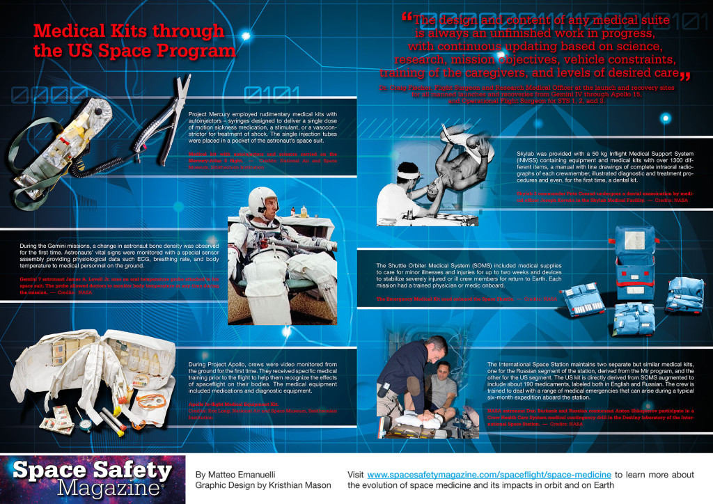 Musgrave, when he was not flying in space, provided also his expertise as medical doctor to design medical equipment for the Space Shuttle program. The medical kits that have flown through the years on every manned mission are clear examples of space medicine’s evolution from a few drugs to complex diagnostic devices and tools to treat the majority of the conditions that can happen while in orbit.